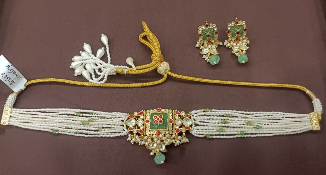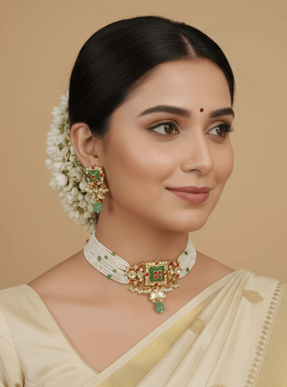Elevate your jewelry collection with our Signature Kundan Jadau Necklace Set. Meticulously handcrafted by master artisans, this set features intricate gold-plated frameworks embedded with high-quality Kundan stones. The design is accentuated by cascading strings of white pearls and coloured beads that offer a regal contrast. Whether paired with a saree or a grand bridal lehenga, this set is designed to be the centerpiece of your ensemble. The lightweight yet statement-making construction ensures you carry royalty with comfort from dawn to dusk.