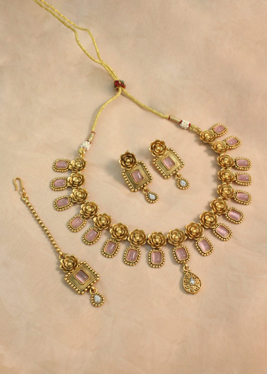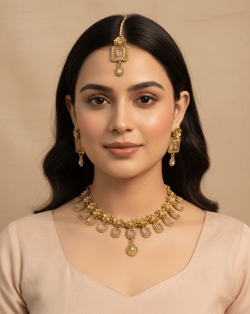 Step into timeless elegance with the Belsis Antique Gold Polki Necklace Set, crafted to reflect the splendor of royal heritage. Featuring intricate Polki stones set in an antique gold finish, this exquisite design is complemented by matching earrings and maang tikka, creating a look that is both graceful and grand. Perfect for weddings, festive gatherings, or heirloom-inspired occasions.