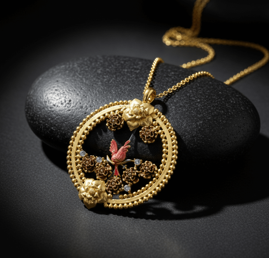Escape into a world of quiet beauty with our handcrafted round necklace, adorned with a charming flower and bird motif in fine enamel. This nature-inspired pendant is a tribute to artistry, elegance, and the delicate balance of nature. Whether you’re dressing up for a special occasion or simply expressing your love for handmade beauty, this necklace speaks volumes in the softest way.