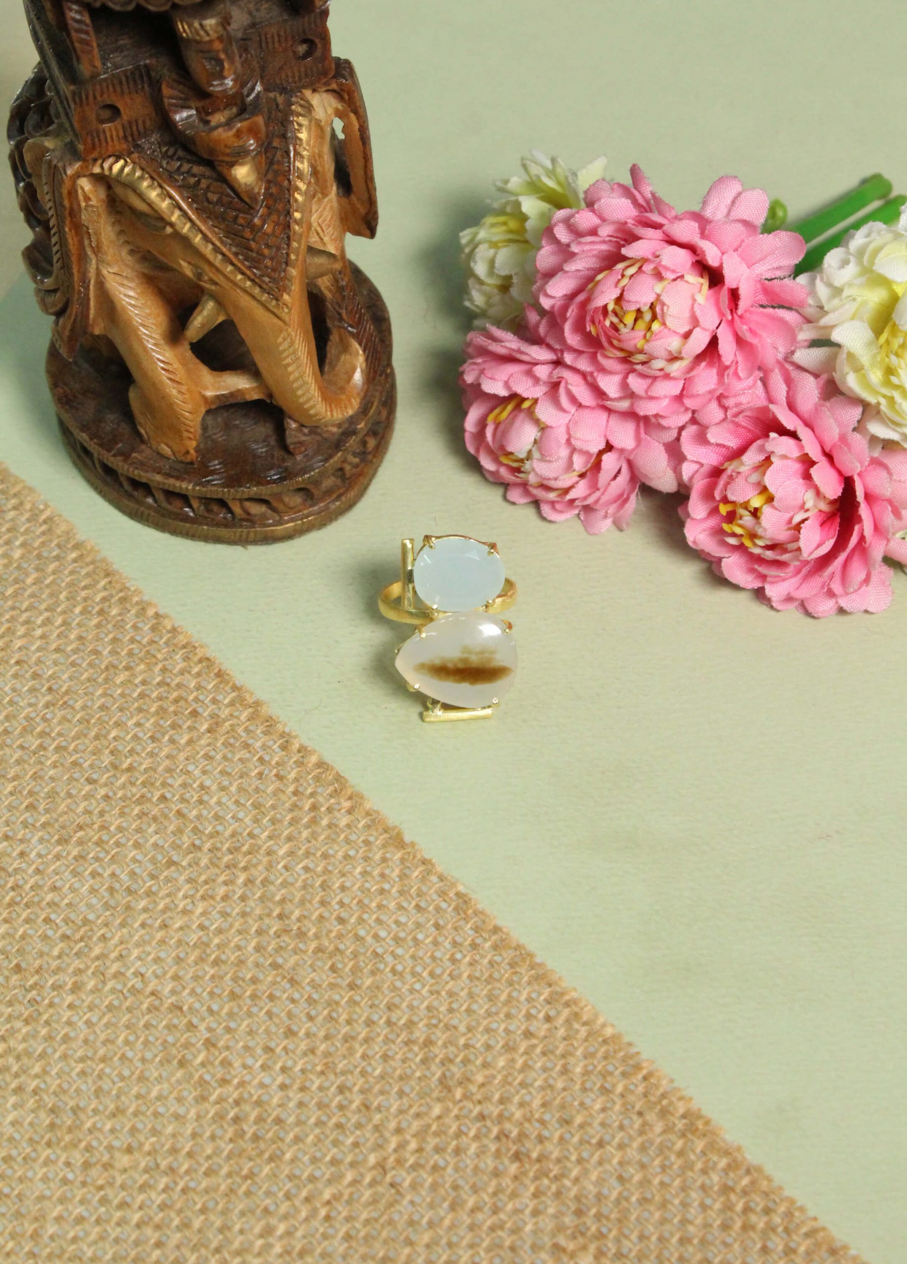 This handcrafted statement ring features a curated duo of calming, nature-inspired stones: a large Agate teardrop paired with the translucent glow of an Aqua Chalcedony Secured within a contemporary, architectural gold frame.