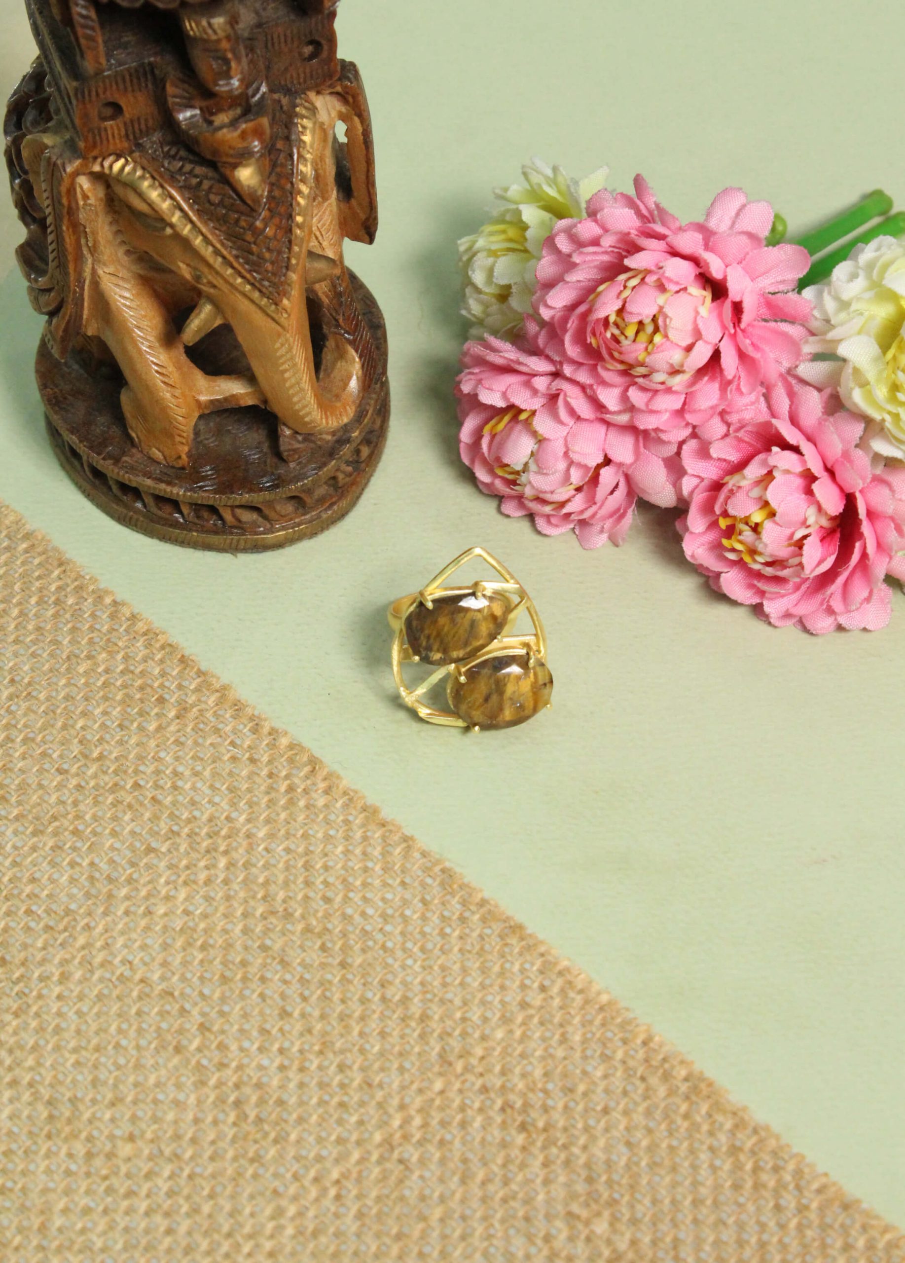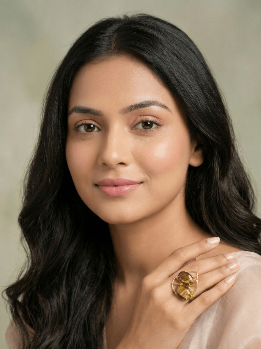 This handcrafted statement ring features a curated duo of brilliant, Faceted Tiger’s Eye stones, Meticulously set within an interlocking “double heart” wire frame, The unique wire-frame silhouette provides a lightweight feel with maximum visual impact, blending contemporary art with wearable jewelry.