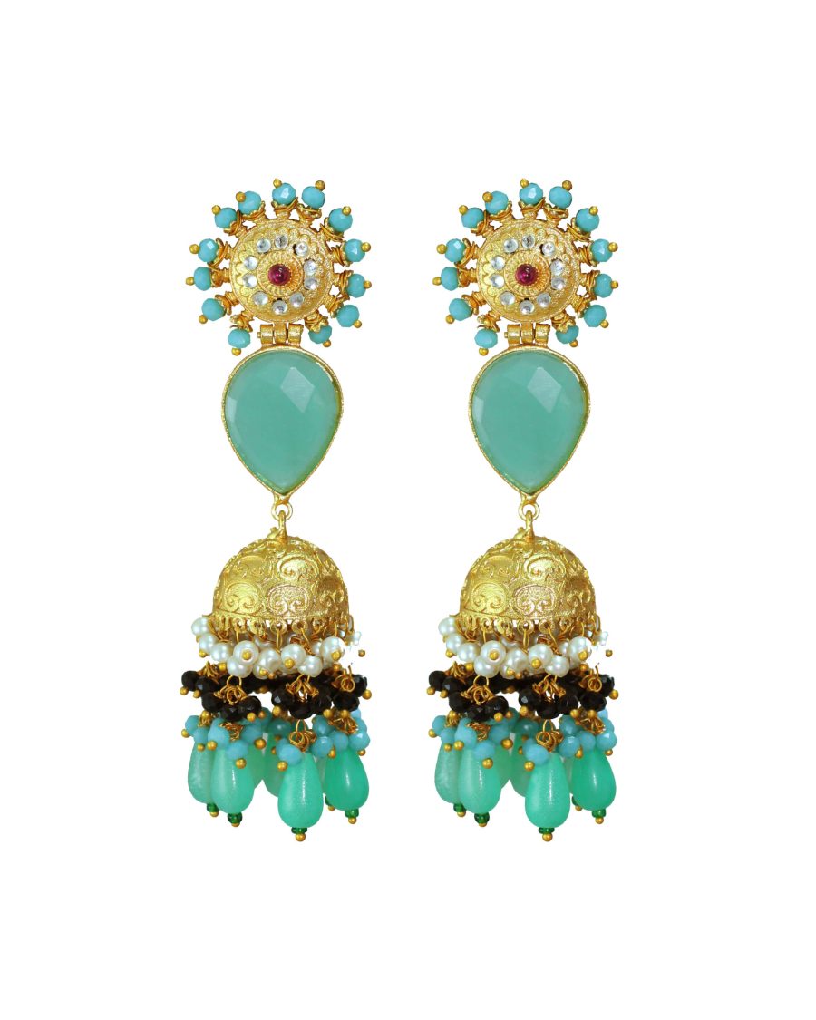 Elevate your ethnic ensemble with a pair that balances traditional grandeur with a refreshing modern palette At the heart of this design lies a resplendent, These handcrafted tiered jhumkas features an intricate sunburst stud with turquoise accents, leading to a mesmerizing, oversized faceted Green Chalcedony. The engraved Jhumka is layered with pristine white seed pearls and contrasting black  beads, finishing with seafoam teardrop droplets.