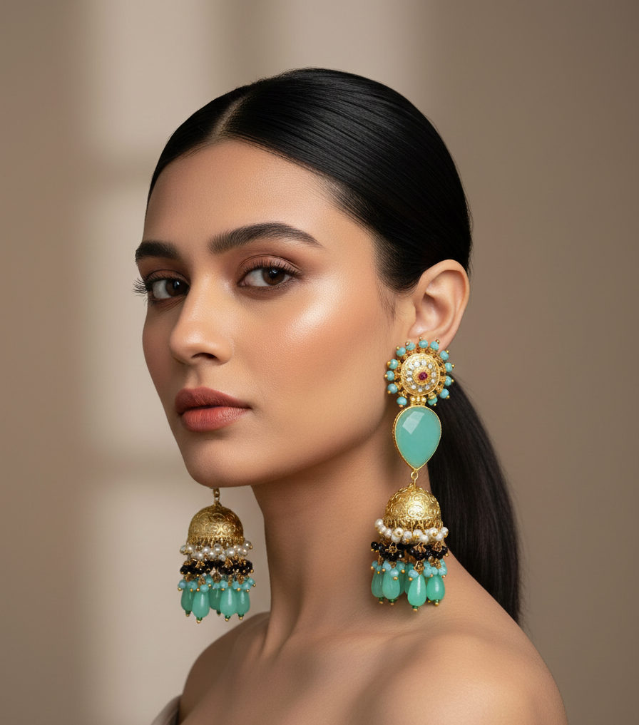 A curated mix of seafoam, turquoise, and gold makes these the perfect accessory for Mehendi, Sangeet, or daytime wedding festivities.