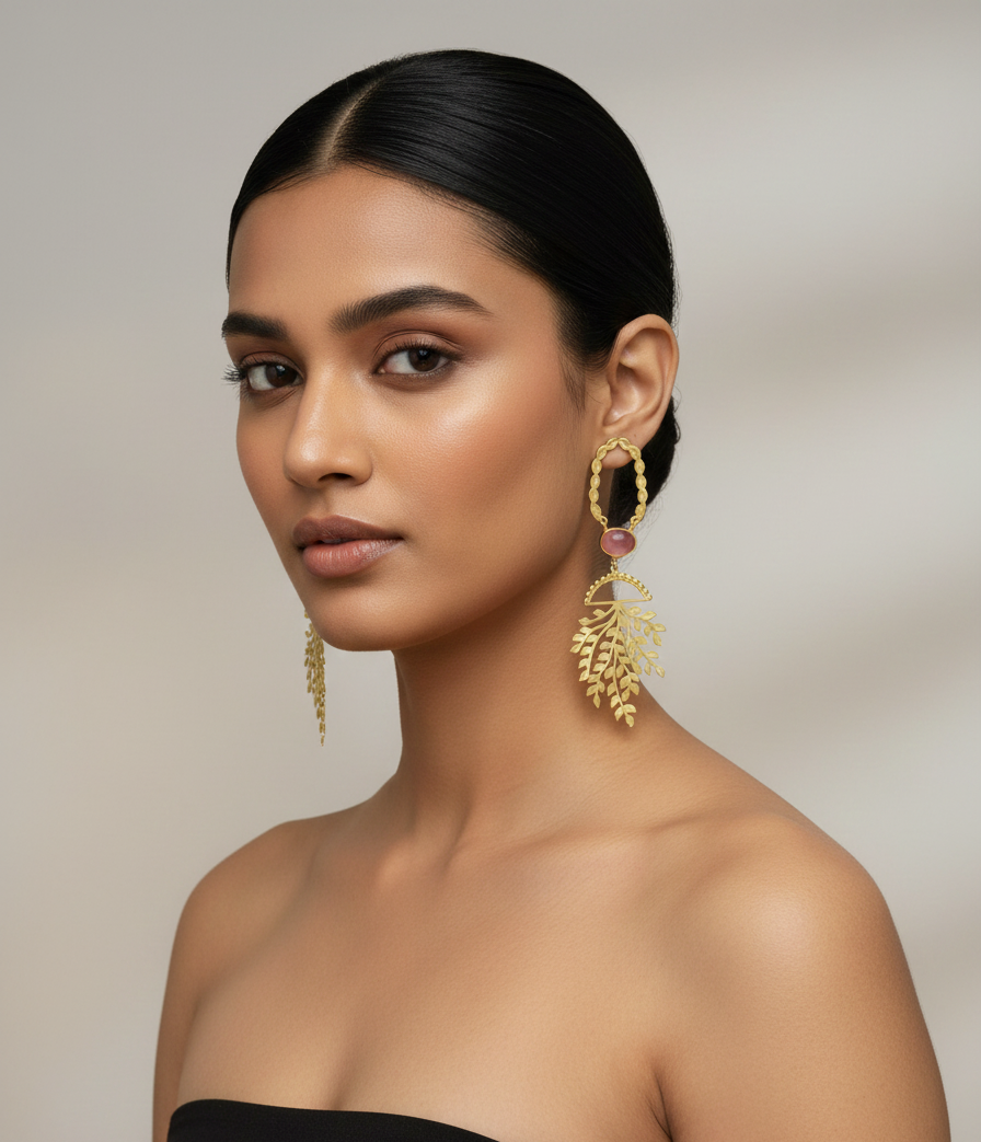 Elevate your style with these contemporary gold toned stone earrings from the Tree of Life collection. Inspired by nature, the design features delicate leaf and tree motifs that capture organic elegance. These nature-inspired long earrings blend seamlessly with western and modern jewelry aesthetics, making them a versatile addition to your wardrobe. Lightweight and eye-catching, they bring a subtle shimmer and artistic charm to any outfit. Whether paired with a casual ensemble or a chic evening look, these earrings offer a perfect balance of earthy beauty and modern design. Let nature’s grace shine through every detail.