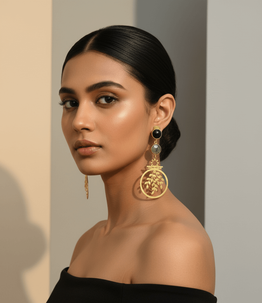 Elevate your style with these contemporary gold toned stone earrings from the Tree of Life collection. Inspired by nature, the design features delicate leaf and tree motifs that capture organic elegance. These nature-inspired long earrings blend seamlessly with western and modern jewelry aesthetics, making them a versatile addition to your wardrobe. Lightweight and eye-catching, they bring a subtle shimmer and artistic charm to any outfit. Whether paired with a casual ensemble or a chic evening look, these earrings offer a perfect balance of earthy beauty and modern design. Let nature’s grace shine through every detail.
