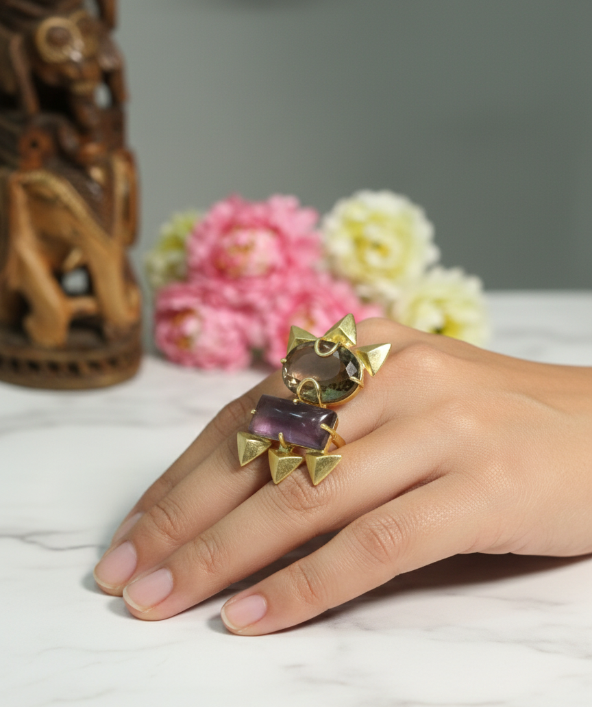 This handcrafted statement ring features a mesmerizing Black Rutilated Quartz—famed for its unique, needle-like black tourmaline inclusions—paired with a sleek, rectangular smoky purple stone. Perfect for layering or statement moments, they’re wearable symbols of quiet opulence.