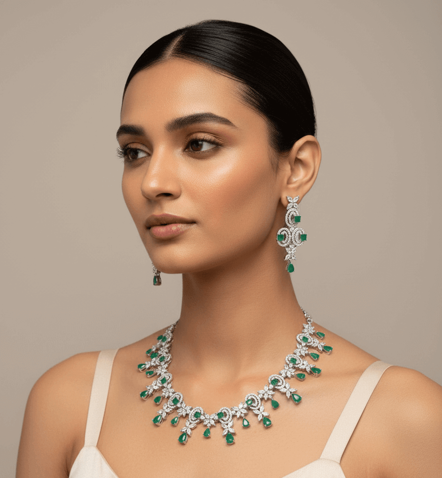 Experience timeless elegance and unparalleled sparkle with our exquisite American diamond Necklace set. Crafted with precision and an eye for detail, each Necklace set features high-quality American diamonds that capture the light beautifully, creating a dazzling effect. Perfect for any occasion, from casual outings to formal events, these set offer a versatile accessory that enhances your look with sophistication and charm.