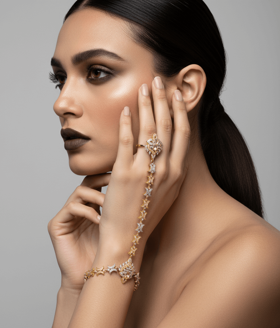 Haath phool is a lovely piece of jewelry that adorns the hands, consists of a bracelet connected to one or more rings by delicate chains or intricate motifs, creating a floral or decorative pattern that drapes gracefully over the back of the hand. Whether worn for weddings, festivals, or special occasions, haath phool continues to enchant with its unique blend of tradition and elegance.