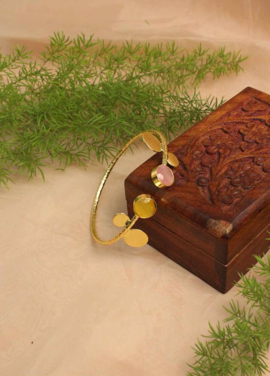 Add a bold touch of glamour to your look with this stunning gold-polish bracelet. Designed with a sleek finish and encrusted with shimmering stones, this piece effortlessly blends modern edge with classic elegance. Whether worn solo or stacked, it’s perfect for festive occasions, evening wear, or statement styling.