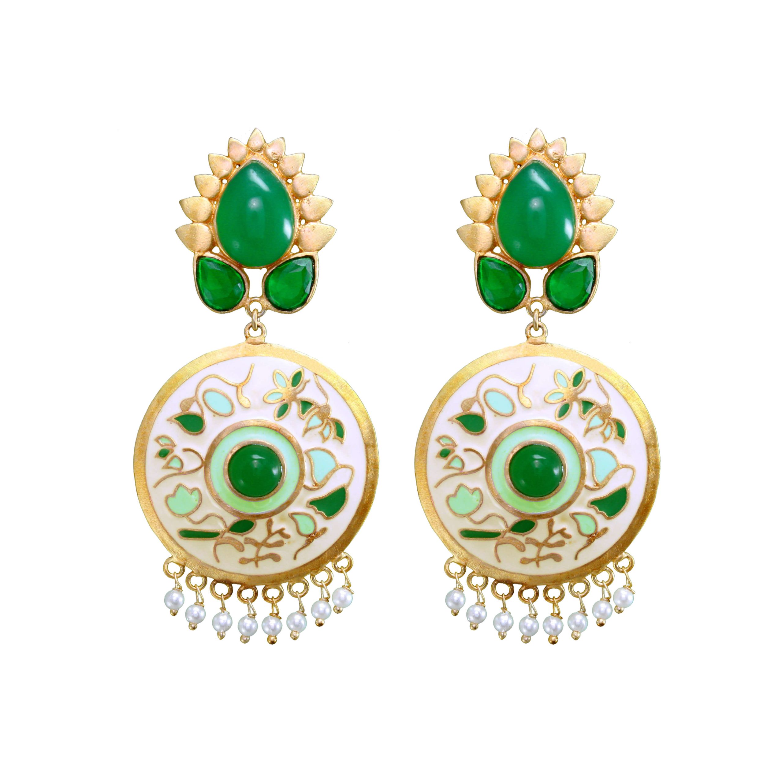 The upper section highlights a teardrop green stone framed in a radiant design, while the lower circular enamel motif showcases delicate artistry and fine detailing. Finished with soft pearl drops, these earrings offer beautiful movement and a refined finish.