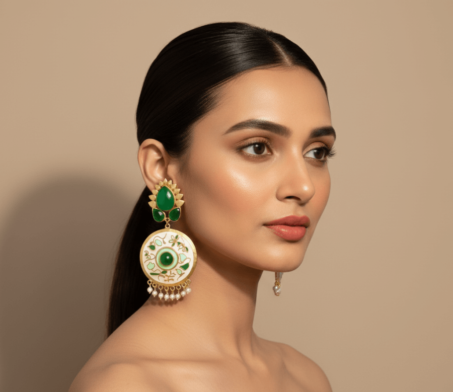 Add a refreshing touch of elegance to your look with these stunning green enamel statement earrings. Featuring a rich green stone centerpiece paired with intricate enamel detailing, these earrings are designed to stand out with their bold yet graceful appeal.