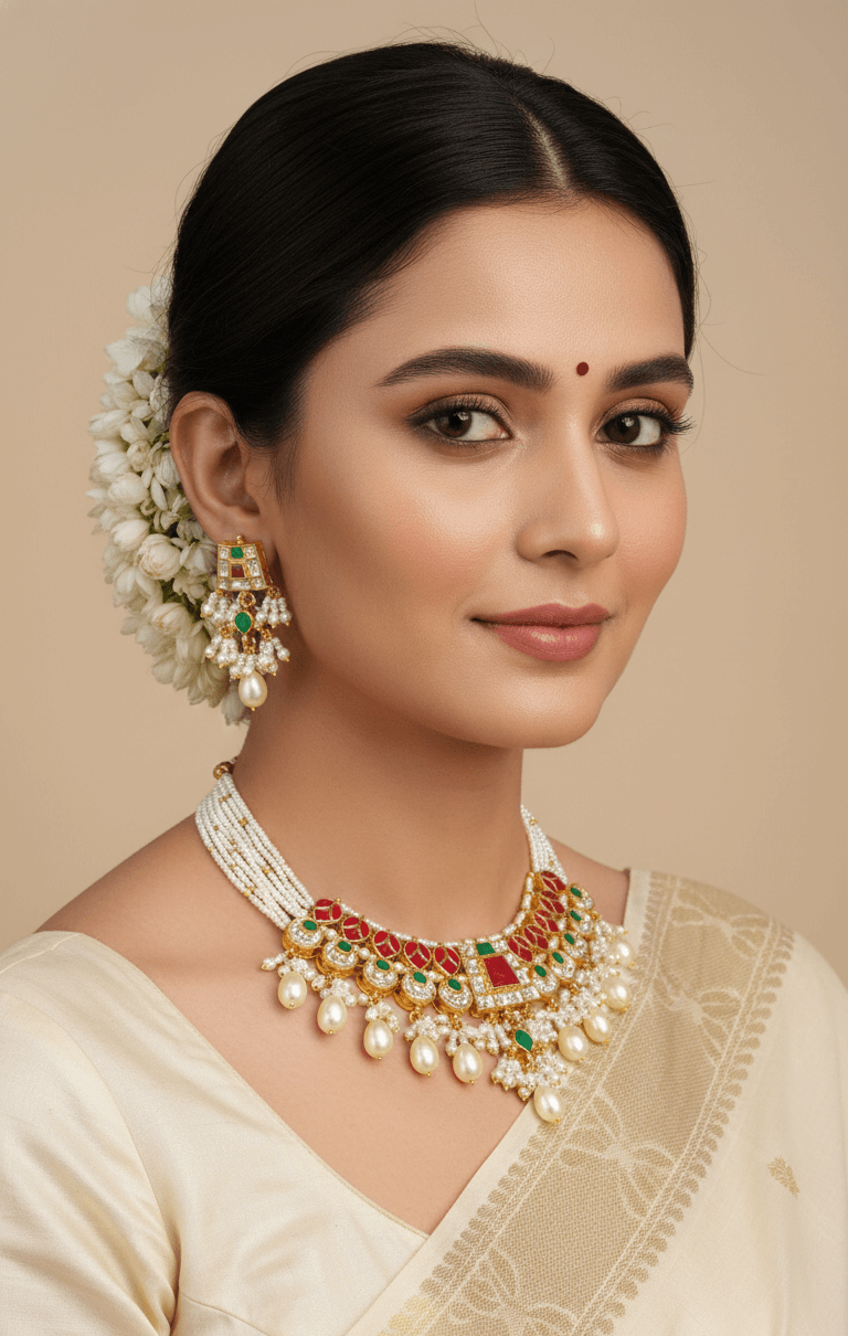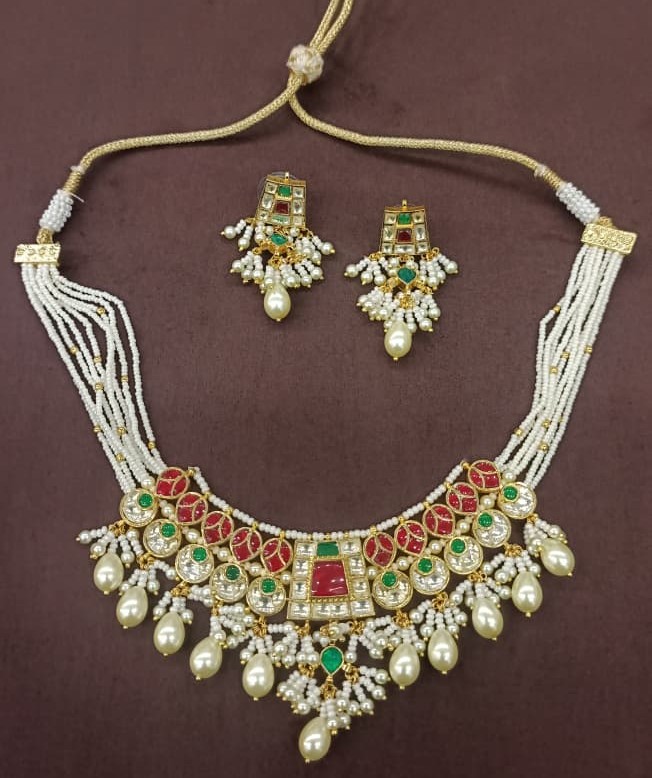 Traditional Kundan Choker Necklace Set with Pearls, Red & Green Stones