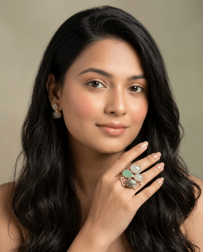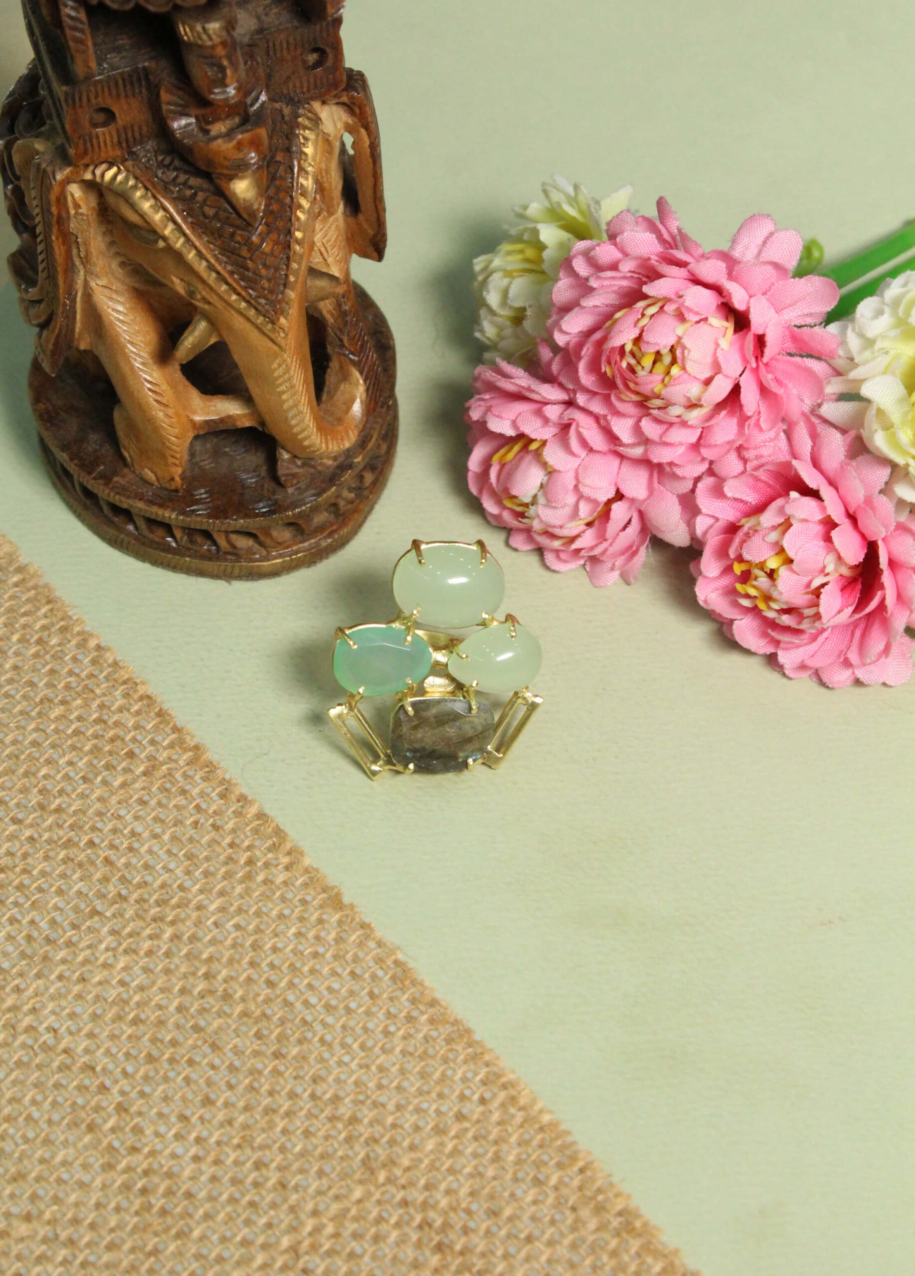 This handcrafted statement ring features a curated cluster of four gemstones: a mystical Labradorite with its signature iridescent flash, a vibrant Chrysoprase, and a pair of tonal Mint and White Chalcedony stones. Housed in a contemporary, geometric gold frame, this ring is a masterclass in modern architectural elegance.