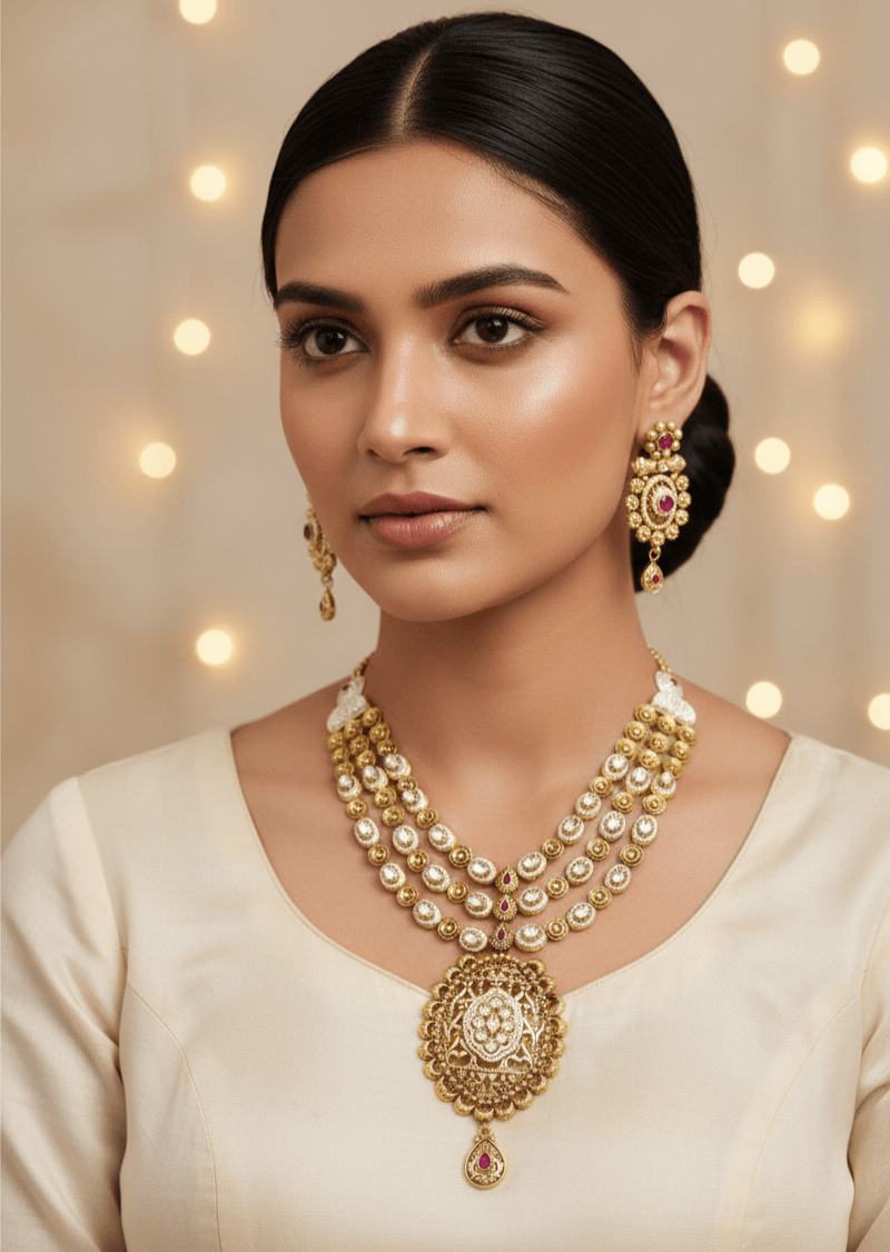 Elevate your traditional look with this exquisite layered kundan temple necklace set, crafted with intricate enamel detailing and adorned with soft pink stone accents. Featuring multiple strands of finely set kundan elements, this necklace creates a rich, regal silhouette that beautifully complements ethnic attire.