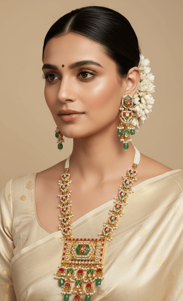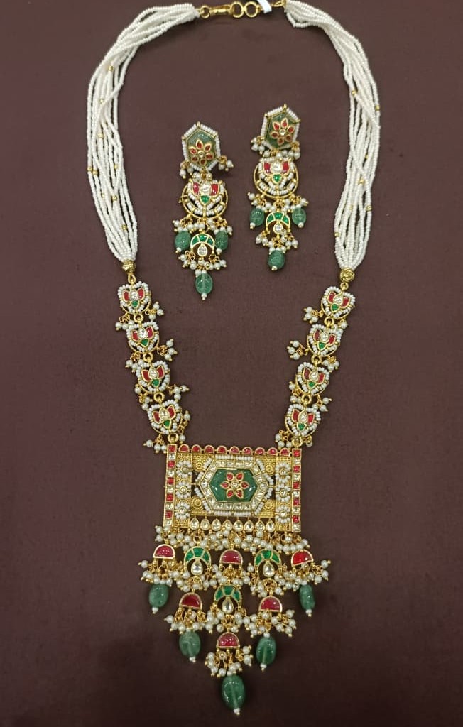 Make a grand statement with this exquisite long kundan necklace set, designed with intricate detailing and rich heritage craftsmanship. Featuring a beautifully structured long chain adorned with red and green stones, this set is highlighted by a bold rectangular statement pendant.