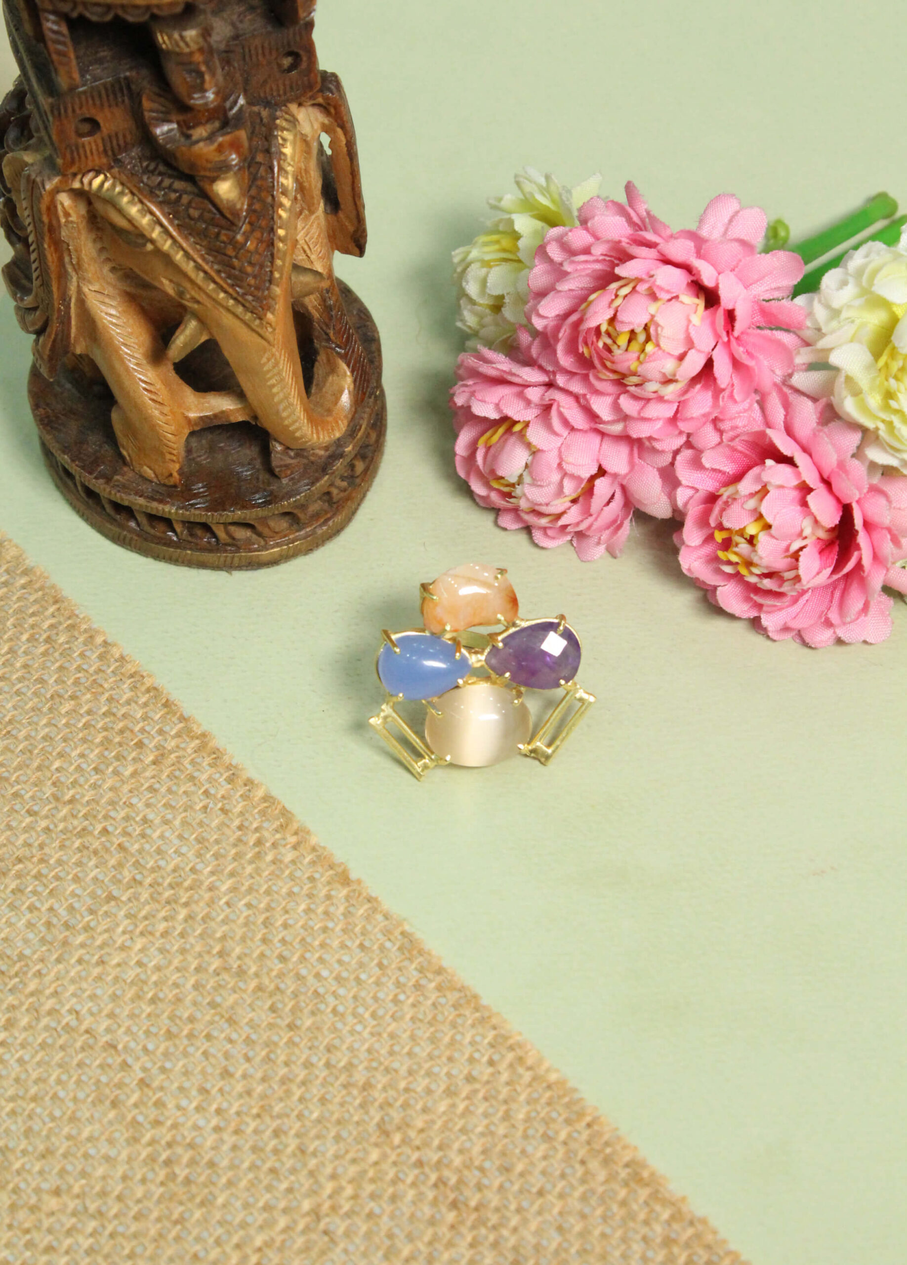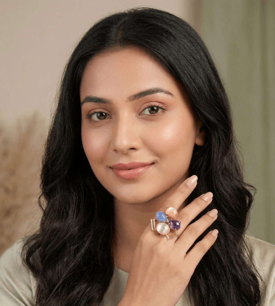 This handcrafted statement ring features a harmonious quartet of gemstones: a regal Purple Amethyst, a luminous White Moonstone, a tranquil Blue Chalcedony, and a warm Peach Cat’s Eye. Set within a contemporary, geometric gold frame, this ring is a masterclass in modern architectural elegance.