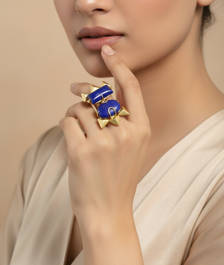 This handcrafted cocktail ring features the intense, regal hue of Royal Blue stones (Lapis Lazuli ), set in a striking dual-stone arrangement Perfect for layering or statement moments, they’re wearable symbols of quiet opulence.