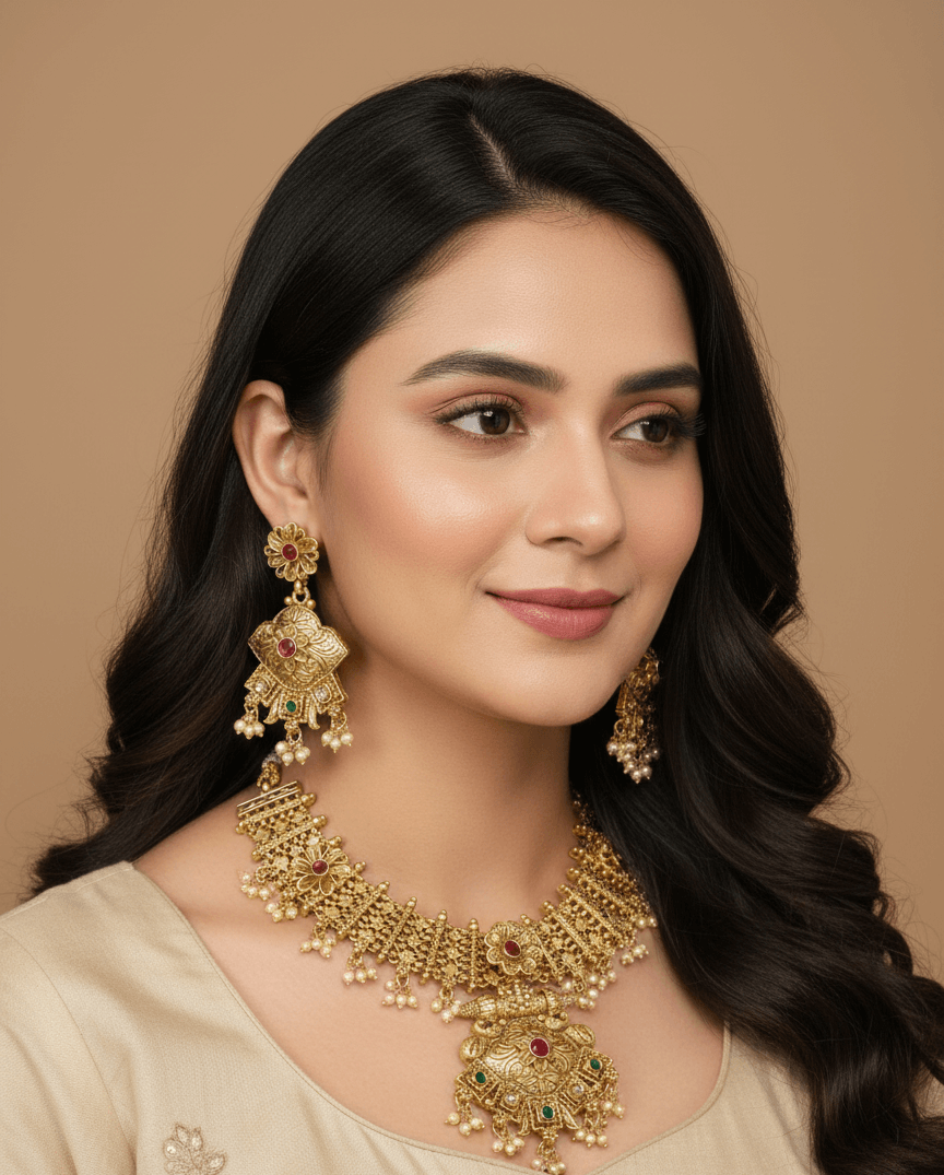 Elevate your jewelry collection with our Timeless Treasure – a stunning gold finish necklace set studded with dazzling Polki stones. Designed to embody regal grace and heritage elegance, this masterpiece adds an aura of timeless charm to bridal wear, festive looks, or cultural celebrations. Its handcrafted detailing and radiant polish make it a perfect blend of tradition and luxury, ideal for the modern woman who honors her roots.
