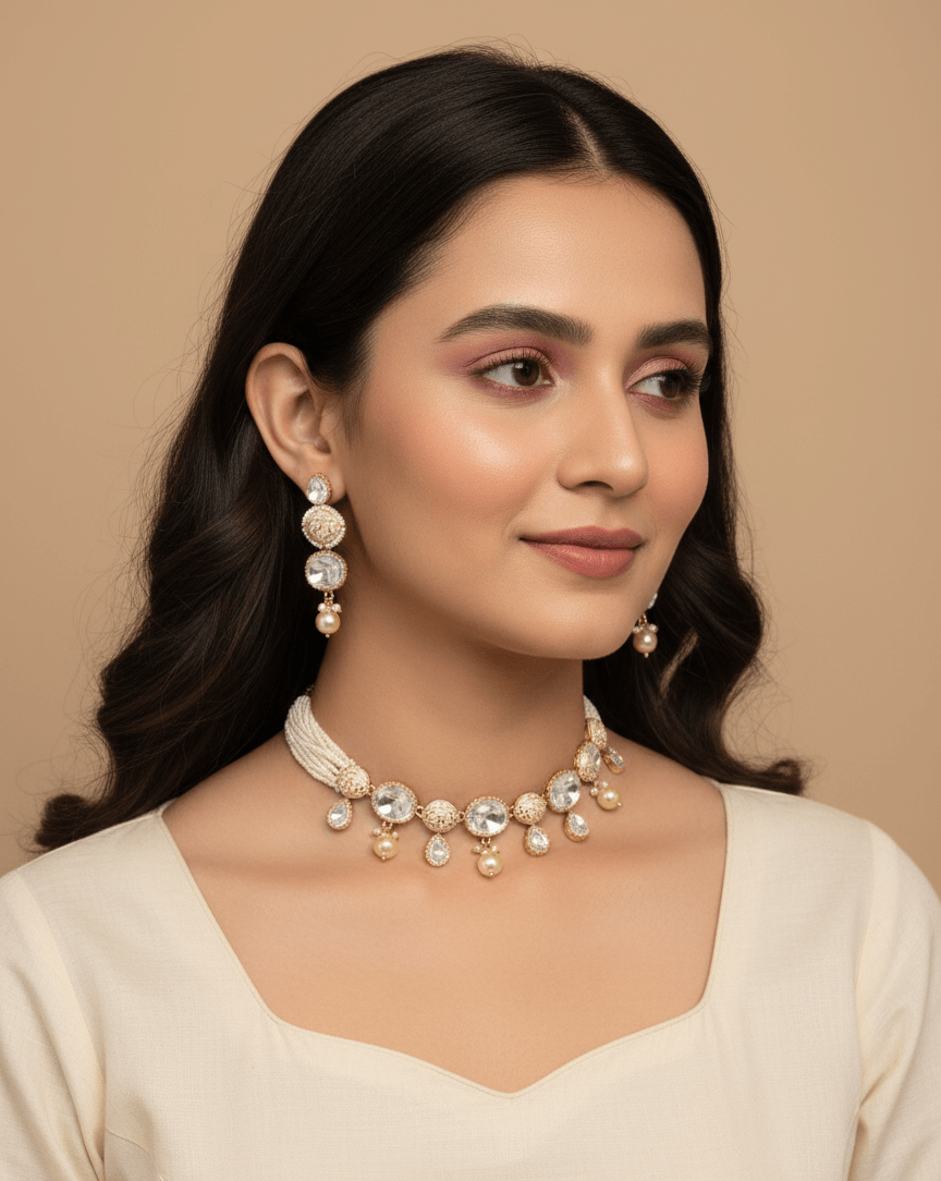 Elevate your jewelry collection with our Timeless Treasure – a stunning gold finish necklace set studded with dazzling Polki stones. Designed to embody regal grace and heritage elegance, this masterpiece adds an aura of timeless charm to bridal wear, festive looks, or cultural celebrations. Its handcrafted detailing and radiant polish make it a perfect blend of tradition and luxury, ideal for the modern woman who honors her roots.