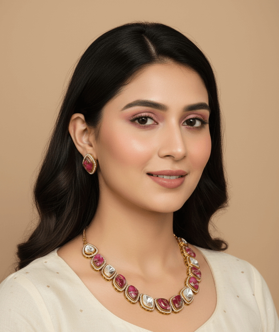 Elevate your jewelry collection with our Timeless Treasure – a stunning gold finish necklace set studded with dazzling Polki stones. Designed to embody regal grace and heritage elegance, this masterpiece adds an aura of timeless charm to bridal wear, festive looks, or cultural celebrations. Its handcrafted detailing and radiant polish make it a perfect blend of tradition and luxury, ideal for the modern woman who honors her roots.