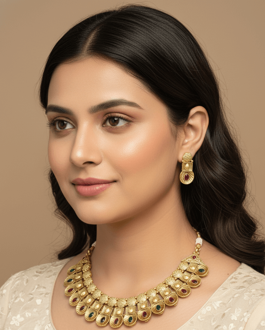 Elevate your jewelry collection with our Timeless Treasure – a stunning gold finish necklace set studded with dazzling Polki stones. Designed to embody regal grace and heritage elegance, this masterpiece adds an aura of timeless charm to bridal wear, festive looks, or cultural celebrations. Its handcrafted detailing and radiant polish make it a perfect blend of tradition and luxury, ideal for the modern woman who honors her roots.