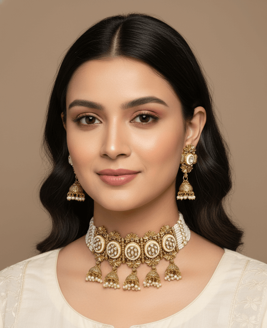 Elevate your jewelry collection with our Timeless Treasure – a stunning gold finish necklace set studded with dazzling Polki stones. Designed to embody regal grace and heritage elegance, this masterpiece adds an aura of timeless charm to bridal wear, festive looks, or cultural celebrations. Its handcrafted detailing and radiant polish make it a perfect blend of tradition and luxury, ideal for the modern woman who honors her roots.