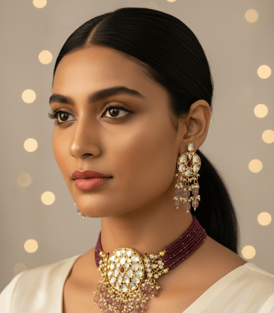 Designed for weddings, festive occasions, and special celebrations, this statement choker sits gracefully on the neckline, offering a perfect blend of traditional craftsmanship and contemporary luxury. Paired with matching earrings, this set is ideal for brides seeking timeless sophistication.