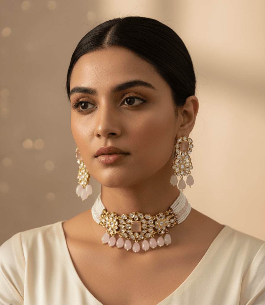 oft, romantic, and effortlessly elegant — this uncut polki choker set is designed for modern brides who love pastel tones. Featuring finely crafted uncut polki stones, the choker is enhanced with delicate blush pink stone accents that add a subtle feminine charm.