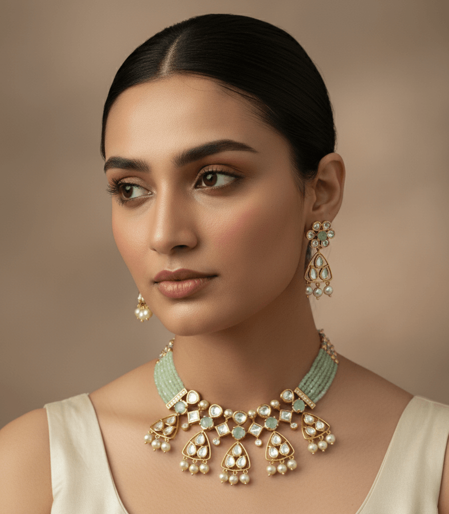 Modern elegance meets traditional craftsmanship in this stunning uncut polki necklace set. Designed with unique geometric motifs, the necklace showcases beautifully arranged polki stones paired with refreshing mint green bead strands.