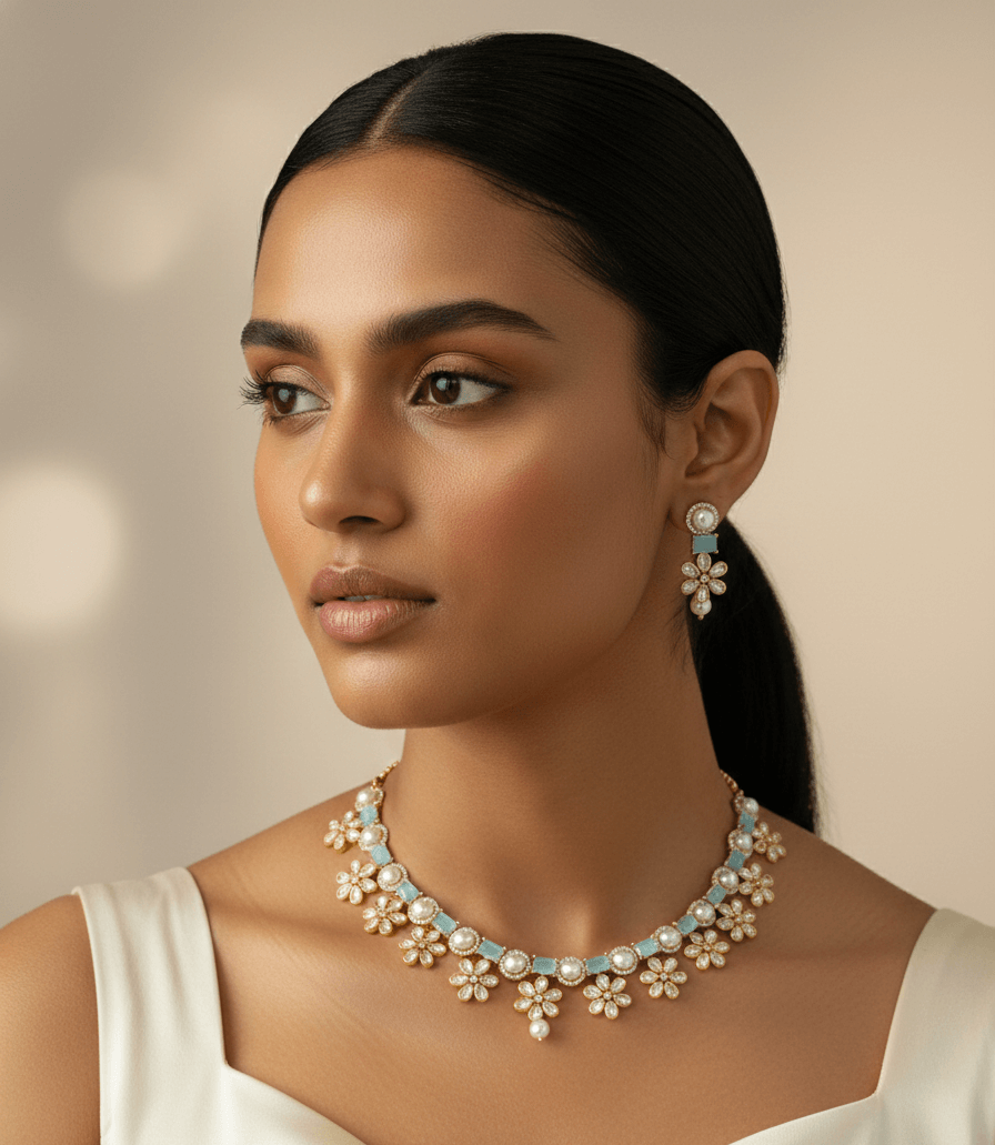 The lightweight necklace sits beautifully along the neckline, adorned with subtle pearl detailing that enhances its feminine charm. The matching earrings mirror the floral design, creating a cohesive and elegant look.
