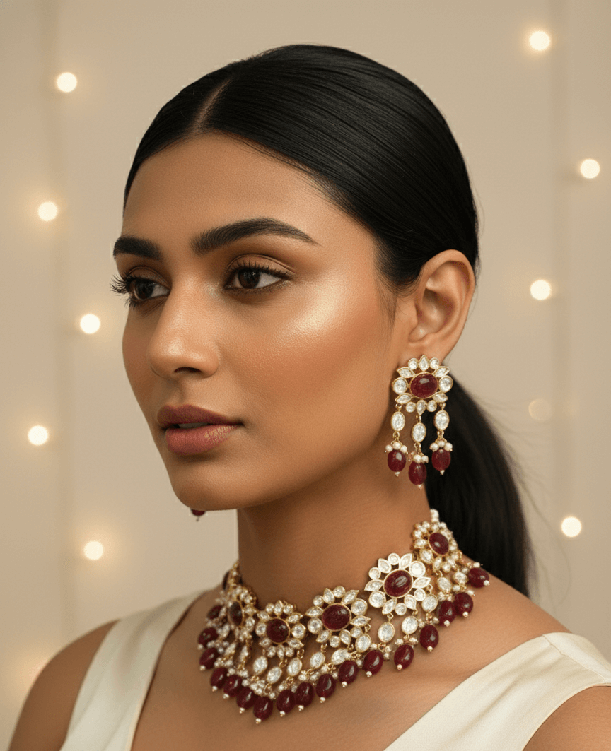 Luxury Uncut Polki Ruby Red Choker Set with Pearl Drops & Statement Earrings