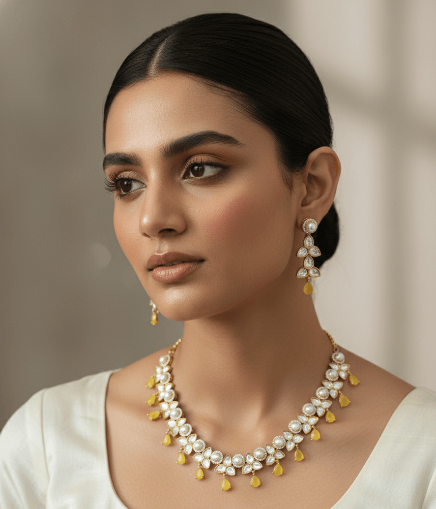 Bright, cheerful, and effortlessly elegant — this uncut polki necklace set is designed to add a radiant touch to your look. Featuring finely arranged uncut polki stones, the necklace is beautifully accented with vibrant yellow bead drops that bring warmth and festive charm.